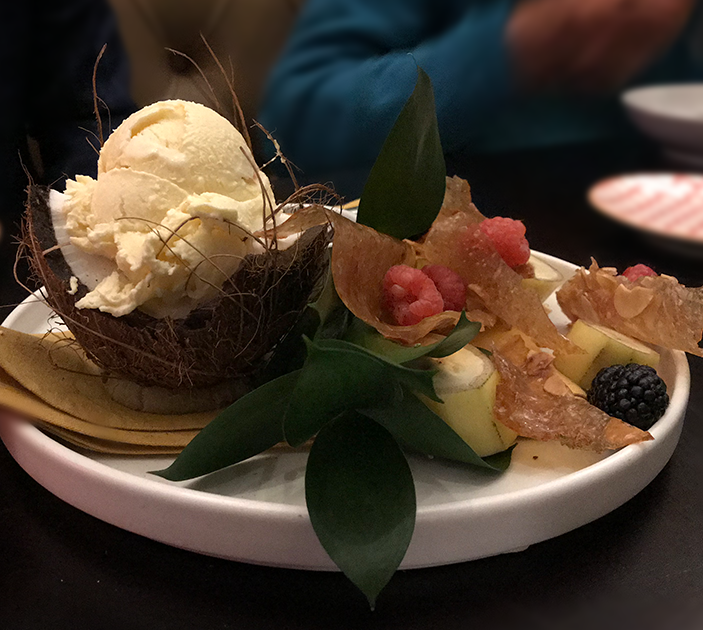INTENSE CHOCOLATE BROWNIE WITH SUGARED PECANS BAKED ON TOP & COCONUT ICE CREAM $16